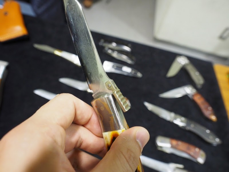そして次に声をかけたのが大渕さん。あのbuttiさんこと大渕さん。フォールディングナイフ製作手法をネットにアップされてた草分けの方!何度も読み直させてもらいました。初めに見せてもらったのがボールナイフ。ベアリングボールが中に入っていて、このボールが動くことでロックがかかるスリップジョイントナイフ!まじかで見れてよかった。